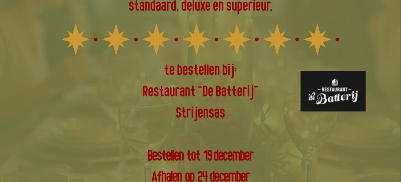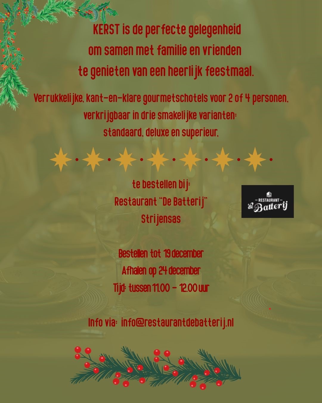 De "Batterij'' Kerstvakantie 2025. Net als vorig jaar genieten wij van de Kerstman en Kerstboom thuis. Uiteraard is de Batterij wel omgetoverd tot een gezellig Kerst Restaurant. Wij zijn op Kerstvakantie van 22 December 2025 tot en met 7 Januari 2026.